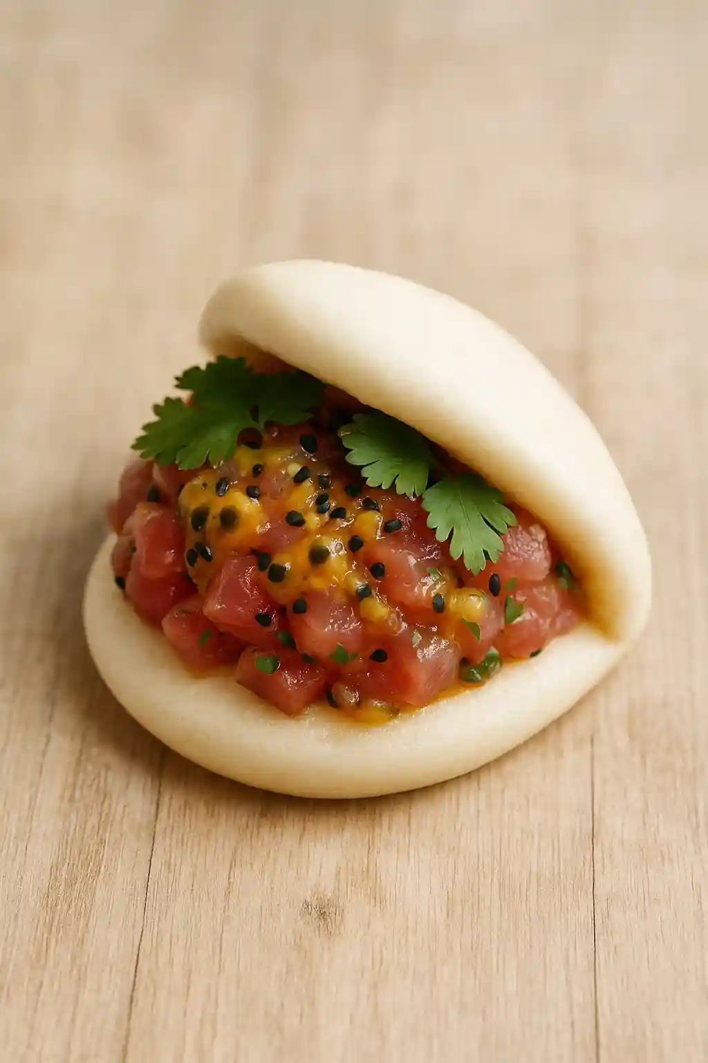 3 Bao Homemade beef teriaki with pan-fried foie gras , 3 Bao Passion tuna tartare, 3 Bao Roasted lobster with yuzu sauce